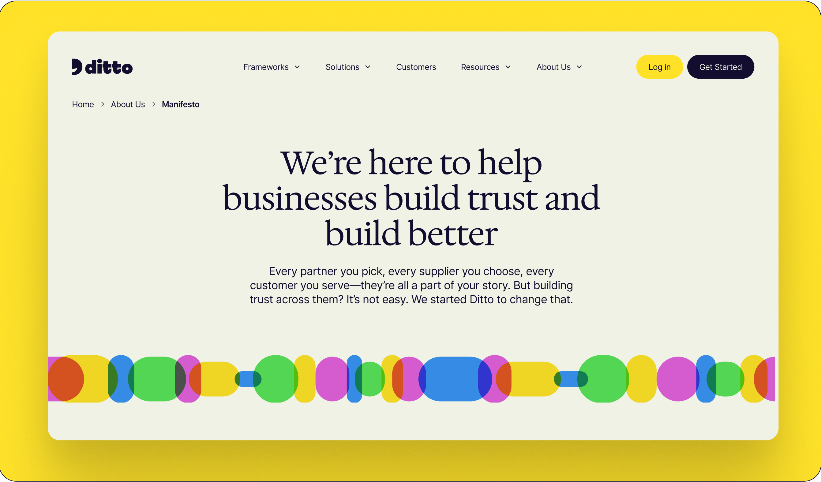 Ditto’s identity is, in a single word, delightful. A smiling logo mark, a vibrant, rainbow color palette—who said B2B SaaS brands have to play it safe? We anchored the design system with a shape-linking brand language as a nod to the partnerships Ditto facilitates and developed an illustration style that envisions the vibrant, sustainable worlds it makes possible. We pulled it all together with a joyfully supportive brand voice and a balanced type system that feels expert, yet approachable and warm.