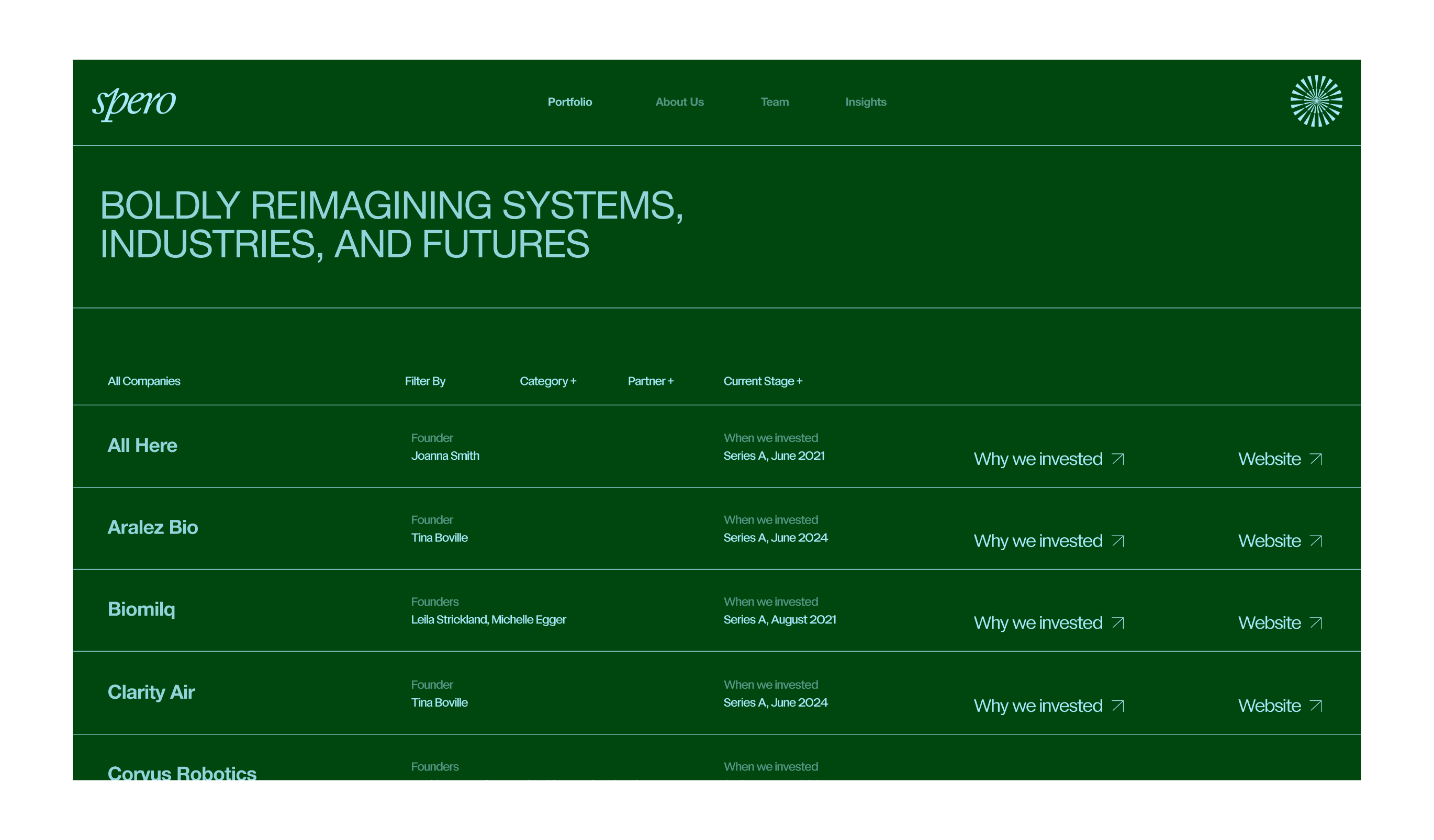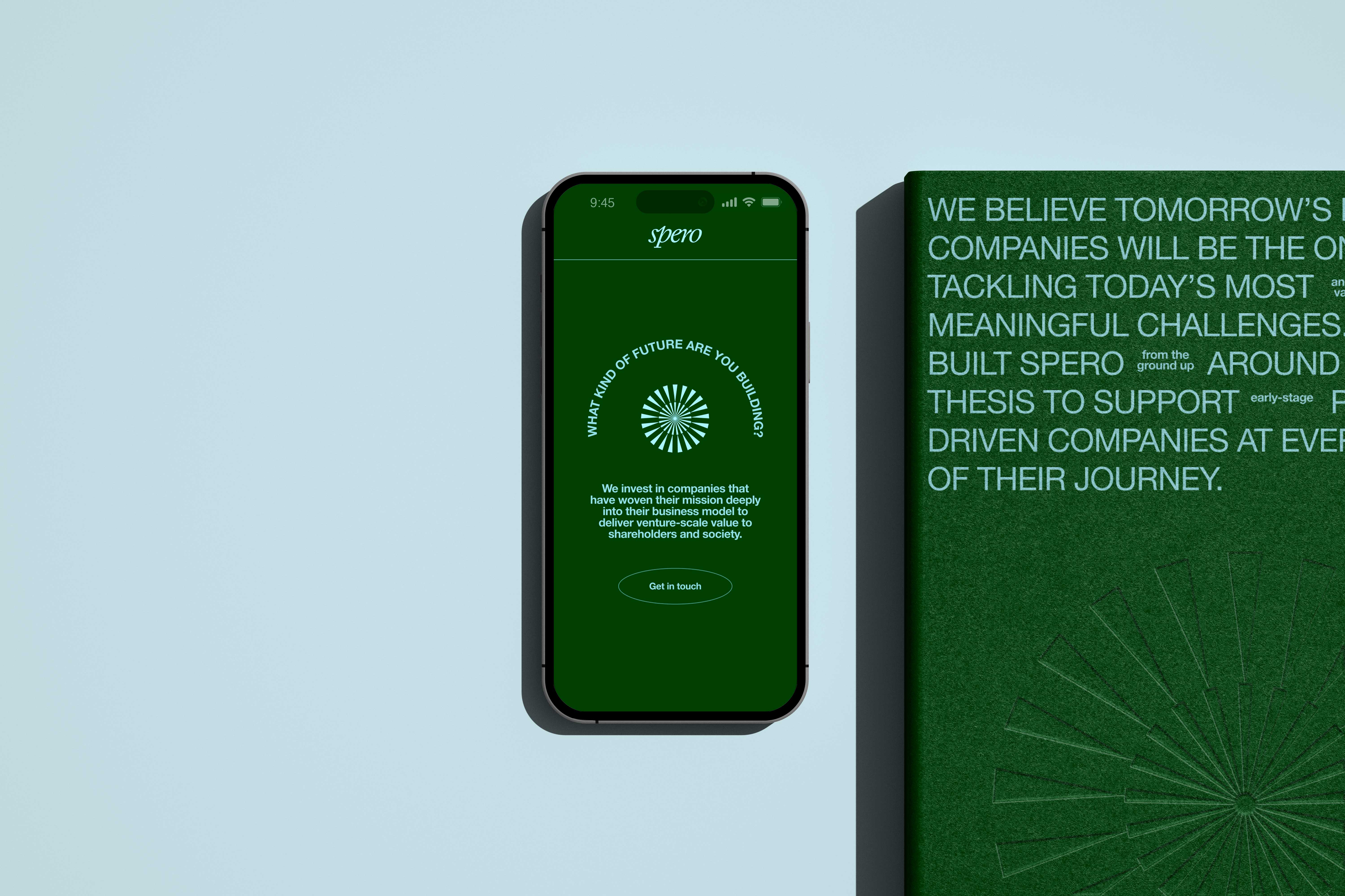 A lot of venture firms talk about taking big swings; few are brave enough to actually back the biggest, boldest of them. Spero does. Because they believe the companies taking on today’s hardest and most meaningful problems are going to be tomorrow's most valuable. Spero invests in early-stage founders who put purpose at the center of their business model, building a healthy, sustainable, and fulfilling future for everyone. Together, we developed a brand to match the scale of their ambition and attract the next generation of purpose-led founders.
